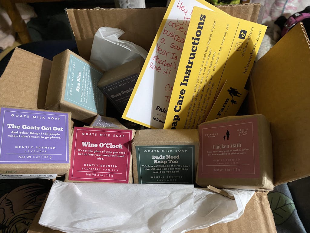 Box of several different soaps to enjoy in the next months. The names of the soap are half the fun! If some friends are lucky, they might just get gifted some of these lovely bars of soap.