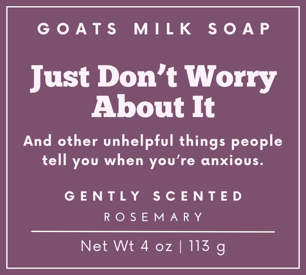 Anxious people, gather 'round—this soap is for you. It’s inspired by the most useless advice we’ve all heard: 'Just don’t worry about it.' If you think that sounds like solid wisdom, well, this soap’s humor might be lost on you. But no worries—you can still enjoy the soothing rosemary scent of this ultra-moisturizing goat milk soap.