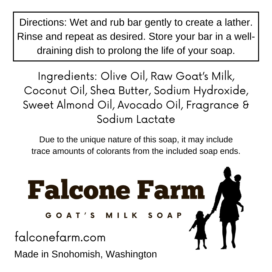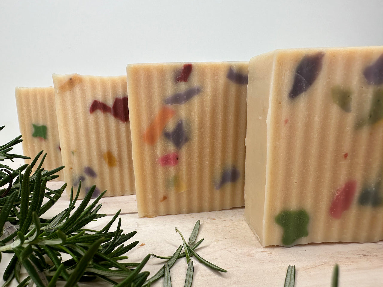 This special soap is made with the soap scraps from previous batches. We believe in reducing our waste in every way possible and this soap is the answer to using up all of our luscious little soap scraps! Due to the special and unique nature of this soap, every bar is completely different and filled with various colors and patterns. If you have any allergies or concerns about the mica colorants used in our soaps, this would be a soap you want to avoid because it can contain a large variety of colorants.